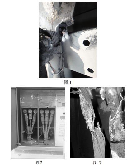 2009年2月15日,回南天,仙村站孔堂線在經(jīng)歷了長(zhǎng)達(dá)18分鐘的間歇性接地后速斷跳閘,重合不成功,電纜分支箱601開(kāi)關(guān)B相進(jìn)線電纜終端應(yīng)力錐處首先短路燒毀(如圖2)。據(jù)分支箱附近商鋪店主反映,箱內(nèi)曾繼續(xù)宣布嘩啪的響聲并冒煙,終究傳出爆炸聲音。經(jīng)開(kāi)始剖析,事端原發(fā)點(diǎn)為B相應(yīng)力錐尾部,因?yàn)槊芊獠粐?yán),硅脂固化,在運(yùn)轉(zhuǎn)環(huán)境濕度較大的情況下呈現(xiàn)凝露,水氣進(jìn)入纜芯,導(dǎo)致絕緣強(qiáng)度破壞產(chǎn)生爬電。終究由間歇性接地發(fā)展到三相短路(如圖3)。此次故障相同導(dǎo)致分支箱氣室破損泄漏,分支箱報(bào)廢。
